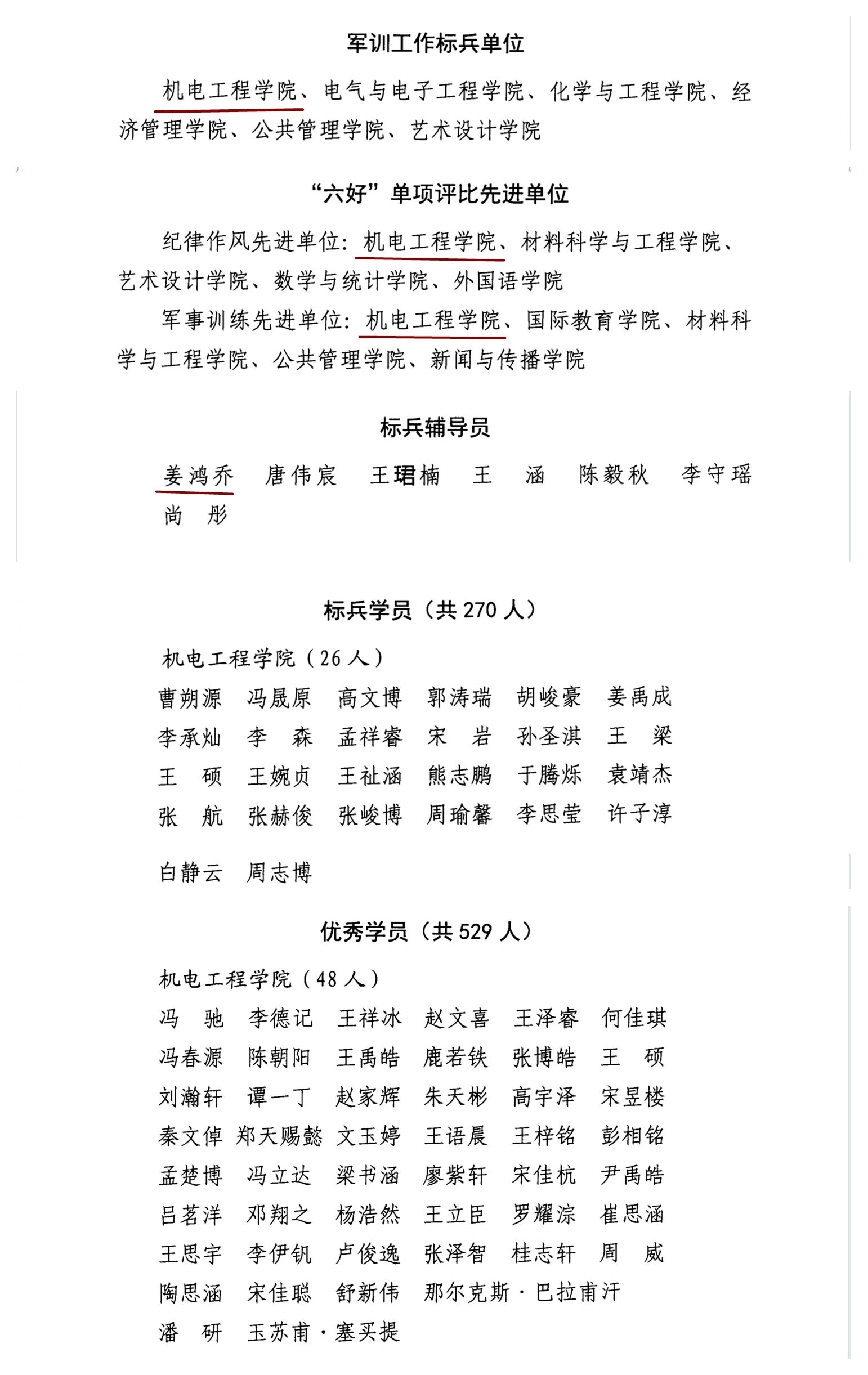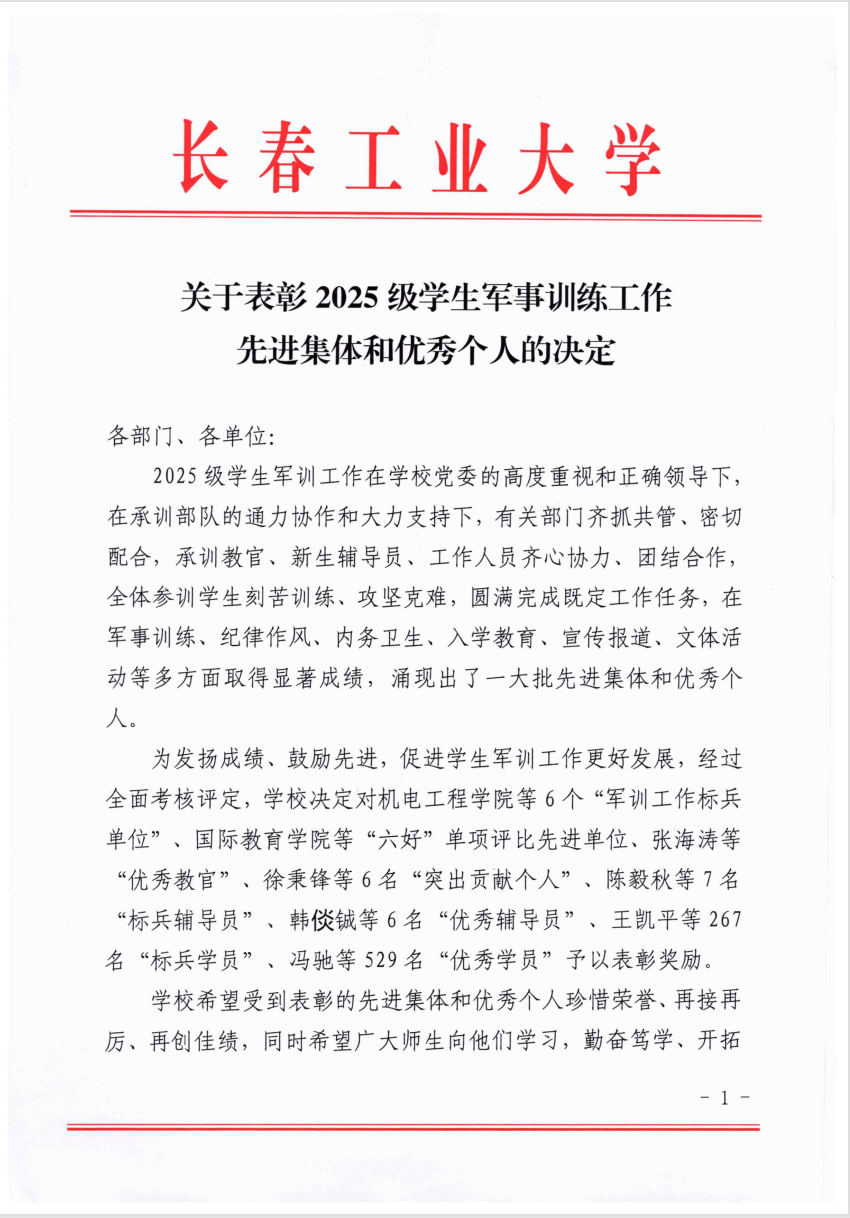 本网讯(通讯员 姜鸿乔)近日,学校公布了《关于表彰2025级学生军事训练工作先进集体和优秀个人的决定》,学院获军训工作标兵单位,“六好”单项评比先进单位、标兵辅导员、标兵学员、优秀学员等多项荣誉。